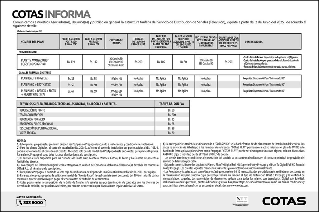 Comunicamos a nuestros Asociados(as), Usuarios(as) y público en general, la estructura tarifaria del Servicio de Distribución de Señales (Televisión), vigente a partir del 02 de Junio del 2025, de acuerdo al siguiente detalle: